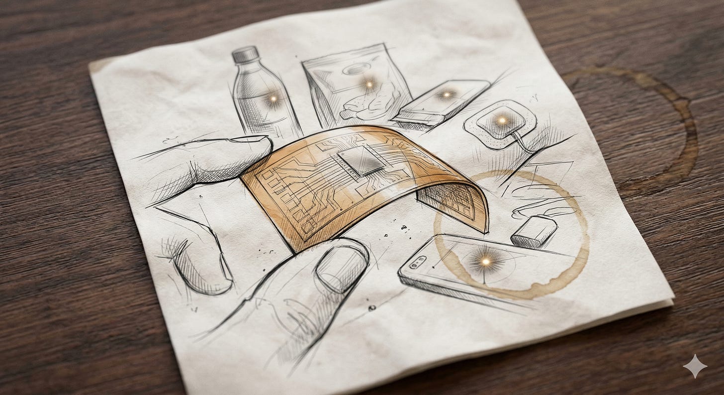But what about the other direction? Not faster chips for data centres, but cheaper chips for everything else. The vast majority of physical objects in the world — packaging, labels, agricultural products, wearable patches — have zero computational capability. The Internet of Things was supposed to change this. It largely hasn’t, because silicon chips are too expensive and too rigid for disposable, flexible, or ultra-low-cost applications.