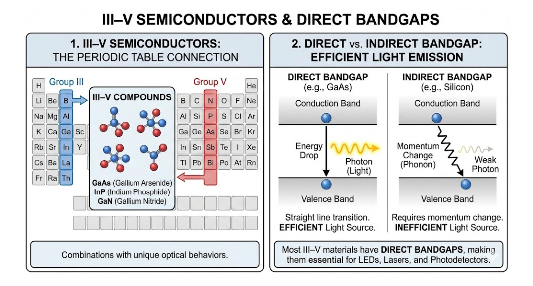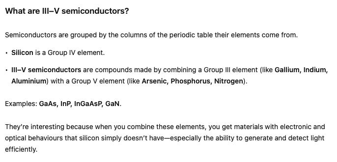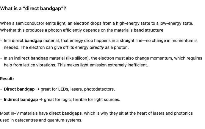 I think the UK and Europe more generally has a massive opportunity to lead in compound semiconductors. Most people associate these materials with electric cars and industrial equipment, where the ability to handle high voltages efficiently matters most. But certain compound semiconductors, especially the III–V materials like InP and GaAs, can efficiently convert electrical signals into light and detect light, thanks to their direct bandgaps. These properties make them candidates for the photonic chips that will move data inside future data centres and quantum computers.
