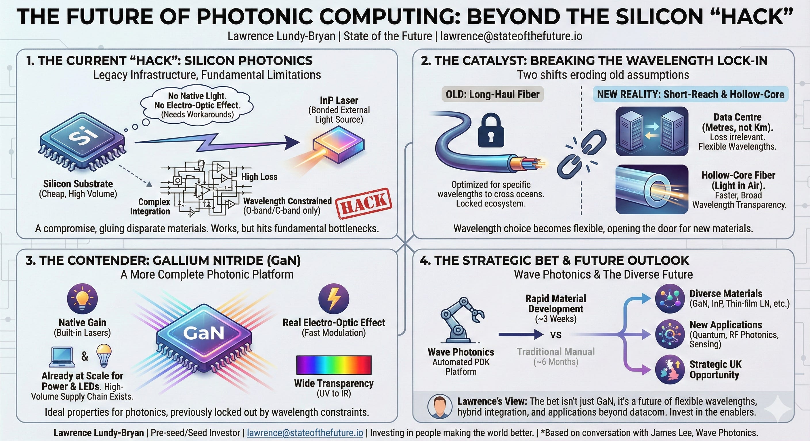I thought his point on O-band and C-band lock-in, and the fact the entire industry is optimised for the 1310nm and 1550nm wavelengths was fascinating. The implications extend beyond gallium nitride. Equipment vendors, laser manufacturers, detector companies, and test firms all optimised for telecom wavelengths because that is where volume was. If wavelength choice becomes flexible, it reopens material and architecture decisions settled decades ago. Silicon photonics won partly on manufacturing cost and partly because it worked at the wavelengths that mattered. If that advantage weakens, silicon’s fundamental limitations as a photonic material become more exposed.