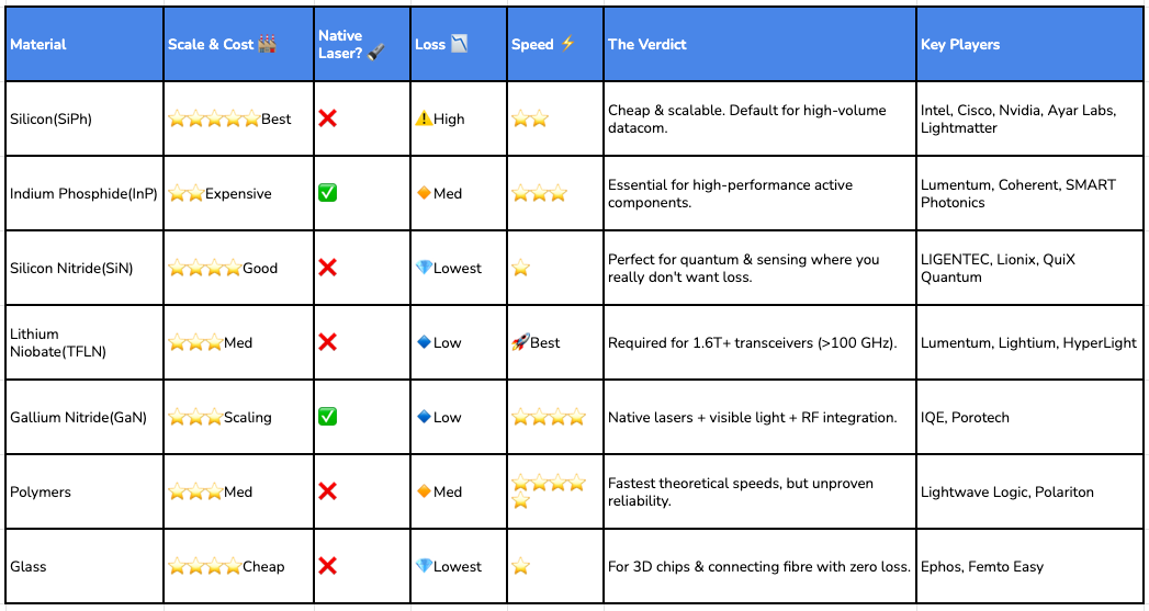 Indium phosphide (InP) generates light natively but manufacturing remains low volume and expensive.